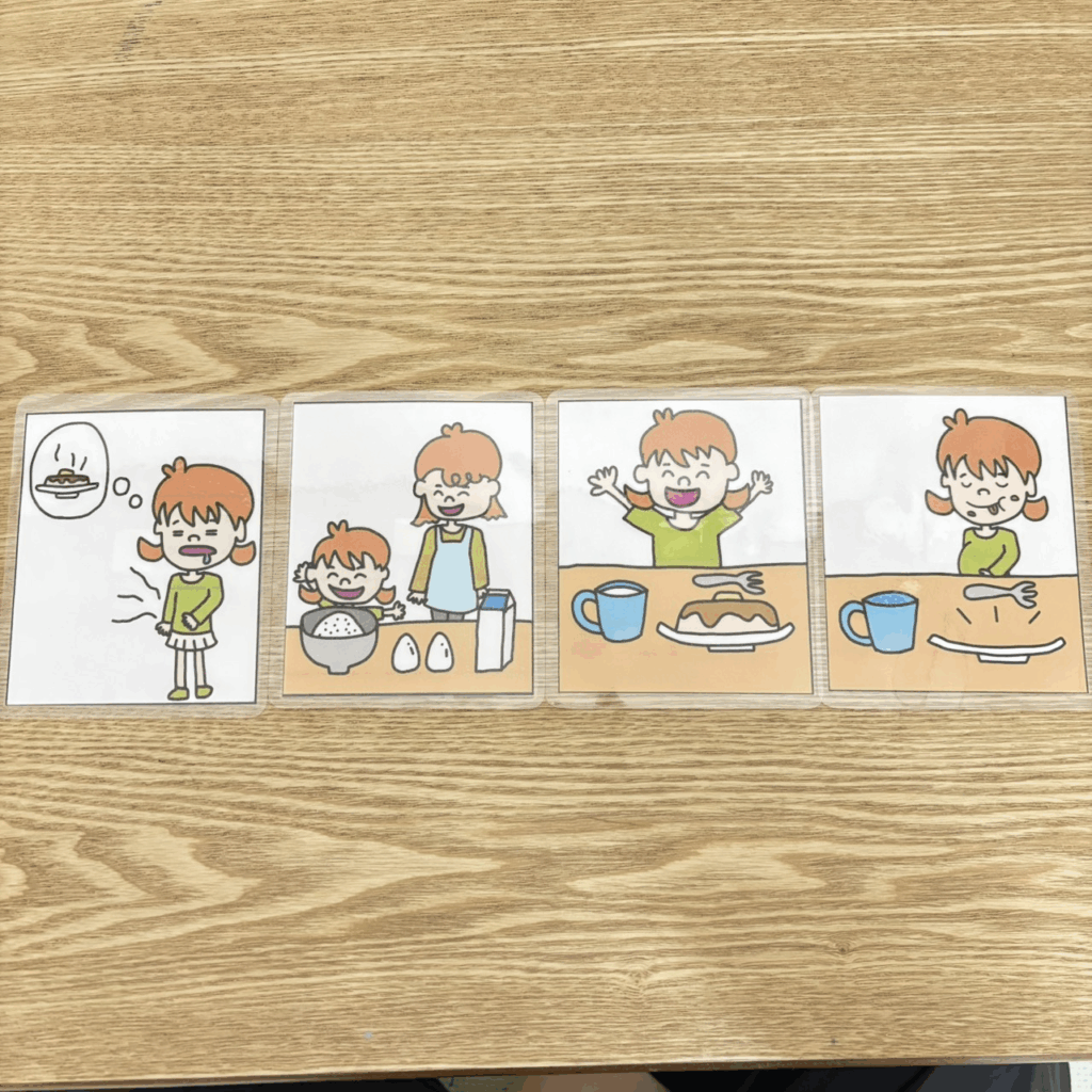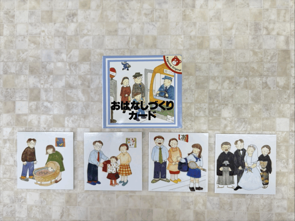 このような4枚のカードを並び替えて1つのストーリーにし、物語をお話してもらう訓練なども